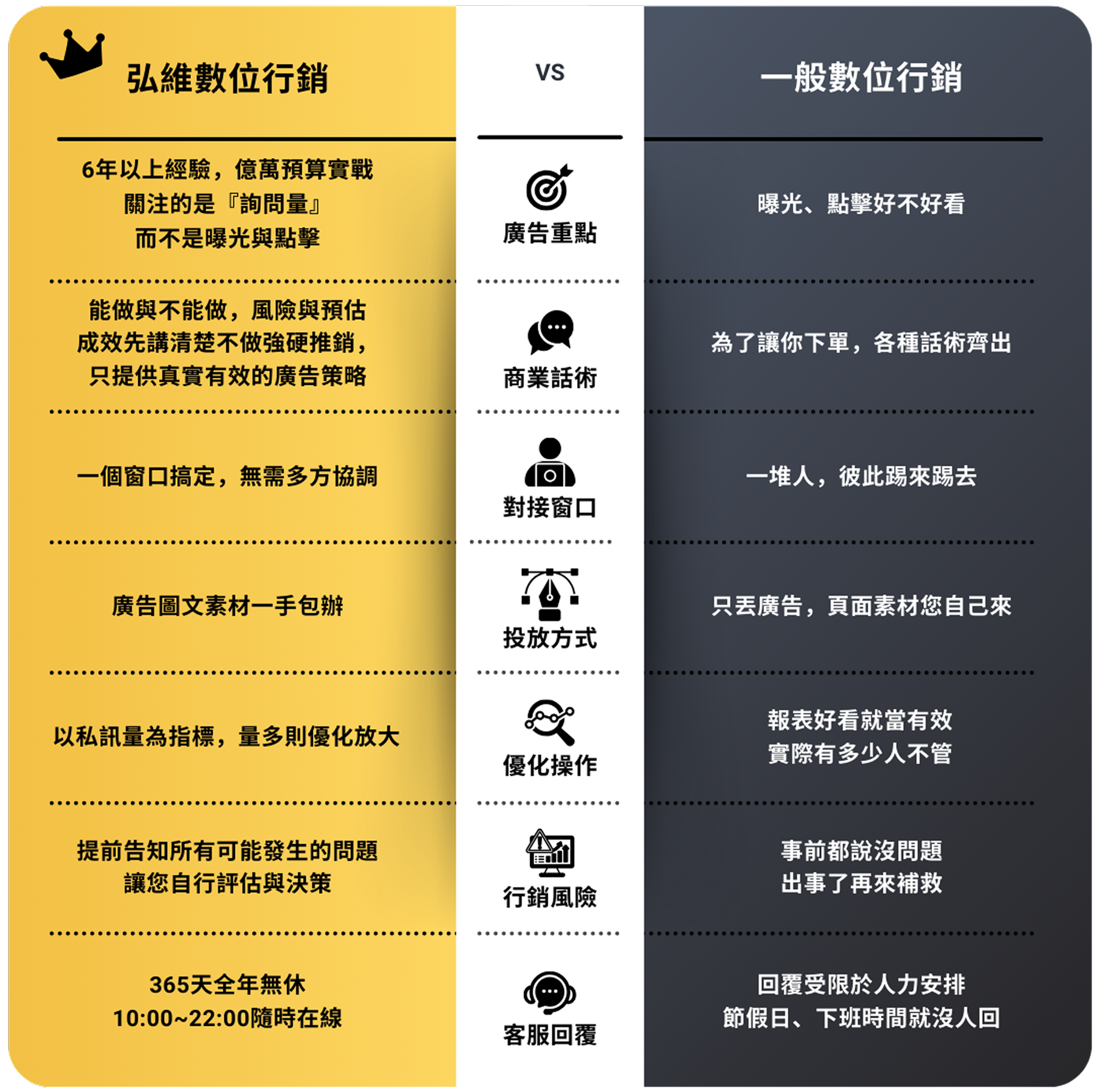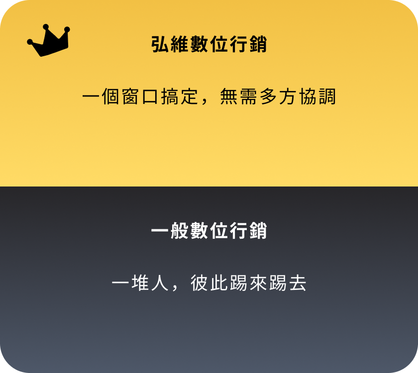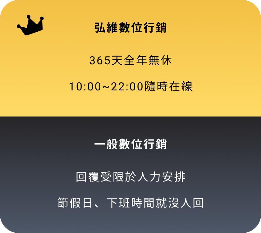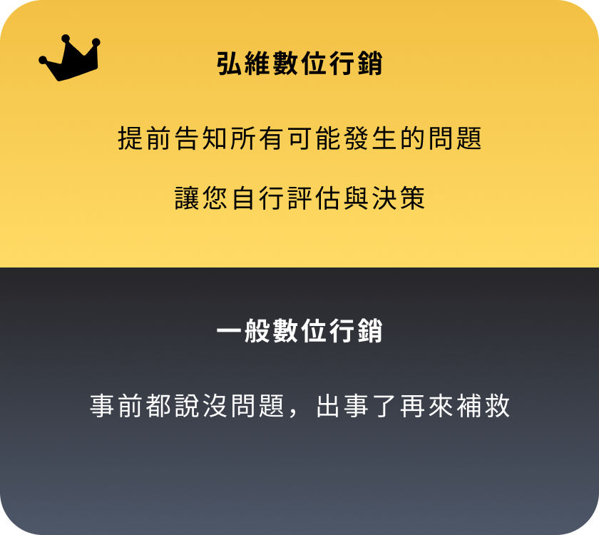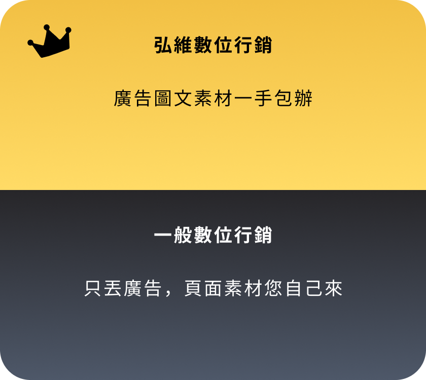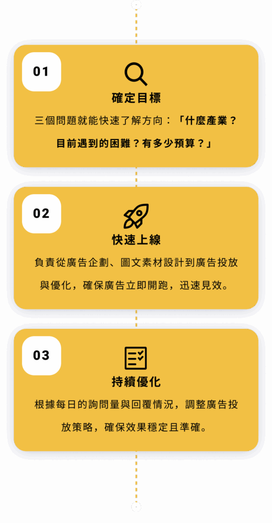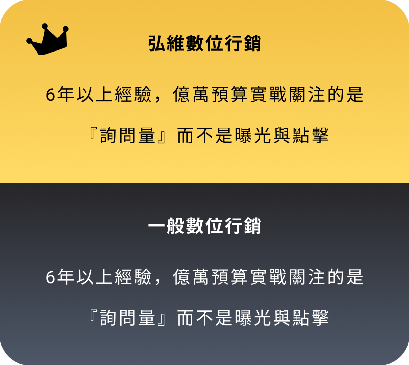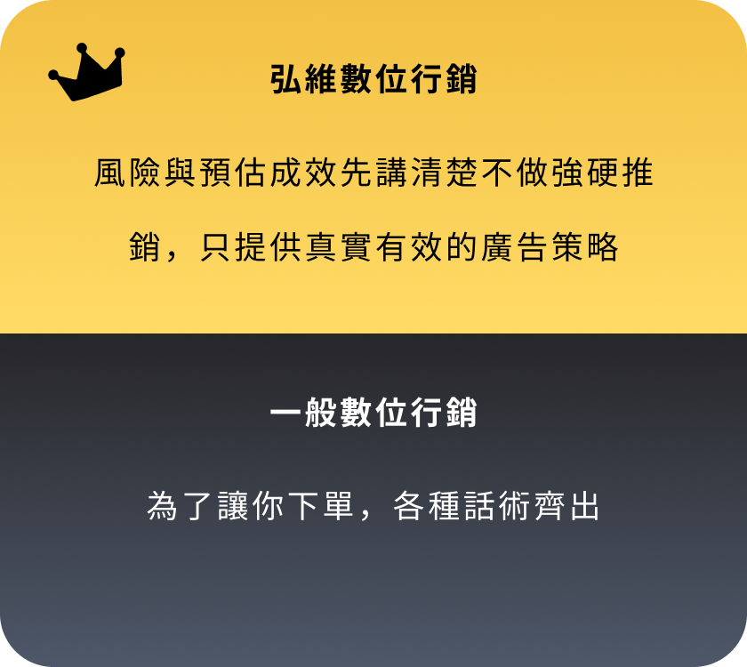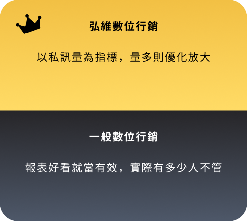 專業私訊廣告代操 廣告不是點擊好看 而是要有人主動私訊您! 打造精準的廣告,讓客戶主動聯繫您! 『沒詢問,就沒成交』 現在市面上70%流量來自「詢問度廣告」,我們專注「衝詢問、接私訊」,我們專注讓您的行業快速吸引主動詢問,將廣告轉化為真實商機。 立即加 LINE,開啟詢問量增長之旅! 我們的私訊型廣告這樣做 把對的人引進來 針對您的產業,引導有需求的客戶,直接私訊找上門! 廣告幫您講重點 用最簡潔有力的廣告方式,迅速引起客戶的注意與需求。 依詢問量調整 根據實時詢問量,調整投放策略,確保每一分廣告預算發揮最大效益。 掌握重點成效 我們不提供繁瑣報表,只關注詢問量與成交量,重點是有多少客戶主動找上門。 不斷持續優化 廣告效果實時追蹤與優化,讓每次投放都更有效。 素材文案全包 不用再找寫手或設計師,文案到設計一手包辦。 數據證明 廣告成效好不好 營收最知道 協助您每月持續不斷獲得客戶,累積事業基底。 每月穩定獲客,打造長久不衰的事業 我們不提供繁瑣報表,只關注詢問量與成交量,重點是有多少客戶主動找上門。 6年實戰經驗 根據產業需求與預算,量身定制最有效的廣告策略,為您帶來具體成效。 超過1E廣告費代操經驗 每月穩定獲得新客戶,且轉化為忠實顧客,助您的事業穩步成長,合作共贏。 365天全年無休 廣告隨時在線,團隊全年無休,隨時調整優化,確保最佳結果。 400+ 客戶合作實績 超過400家來自各行各業的客戶,詢問量顯著提升,效果顯而易見。 滿意度回饋 客戶真實合作心得 加LINE諮詢,告訴您私訊廣告怎麼爆量 滿意度回饋 客戶真實合作心得 廣告代操很多,但能長期幫您穩定拿到名單的團隊,不多。而我們就是其中一個! 為什麼您的廣告可能無效? 沒有清晰策略與精準目標的廣告,就像在浪費金錢。 廣告代操很多,但能長期幫您穩定拿到名單的團隊,不多。而我們就是其中一個! 外燴、包場、品牌加盟評估等 民宿、旅宿業、旅行社 房仲、建案代銷、租賃管理 補習班、才藝班、各類課程(創業課、手作課、語言學習) 牙醫診所、復健治療、長照機構 斜槓創業、加盟推廣、金工體驗、手作體驗 室內設計、水電、裝修工程、居家清潔、冷氣清洗、搬家公司等 婚攝/婚錄、婚企、婚禮主持、花藝、樂團、活動企劃、場地租借等 中古車/重機買賣、保修維修、汽車包膜及美容等 寵物美容、寄宿、訓練、寵物攝影、寵物殯葬等 B2B產業、客製印刷、包材、商用機械設備、系統/網站開發等 美甲、美容、美睫、美髮 健身、瑜伽、私人教練 以上列舉的只是我們曾經合作過的部分行業。如果您的產業不在其中,但同樣需要提升詢問度,歡迎與我們聯繫。我們將為您提供免費的成效投放評估,幫助您找到最適合的廣告策略。 以上列舉的只是我們曾經合作過的部分行業。如果您的產業不在其中,但同樣需要提升詢問度,歡迎與我們聯繫。我們將為您提供免費的成效投放評估,幫助您找到最適合的廣告策略。 您的產業也需要私訊量多?趕快聯繫我們! 高效快速 如何與弘維合作? 確定目標 三個問題就能快速了解方向:「什麼產業?目前遇到的困難?有多少預算?」 快速上線 負責從廣告企劃、圖文素材設計到廣告投放與優化,確保廣告立即開跑,迅速見效。 持續優化 根據每日的詢問量與回覆情況,調整廣告投放策略,確保效果穩定且準確。 立即免費諮詢 關於私訊廣告,您可能會想問的問問題 Q1:廣告預算要多少才適合? A: 預算會根據不同產業有所不同,建議最低預算為3萬,若能達到10萬以上,效果會更顯著,主要體現在試錯空間、穩定度、彈性與詢問度的提升。 Q2:廣告多久看到效果? A: 大多數情況下,1-2天內會開始收到客戶詢問,約 15-30天 達到穩定的每日詢問量,30-60天 內進行持續優化,提升效果。 Q3:廣告素材要我自己準備嗎? A: 如您已有素材,可以提供給我們,我們會進行評估並規劃;如果沒有,您也可以交由我們來製作。 Q4:如果廣告過審會卡嗎? A: 不同產業有不同策略,一般行業不會遇到這問題。如果是灰色產業(如金融借貸等),我們擁有豐富經驗,能進行必要的調整,確保廣告順利過審並上線。 Q5:FB 廣告是不是要一直砸錢才有效? A: 並非如此!我們會先進行定額測試,找到最有效的廣告組合,確定後再放大預算,讓每一分錢都花得值。 Q6:廣告上線後,我需要每天盯嗎? A: 您不需要監控廣告,這是我們的責任!您只需專心回覆客戶訊息並處理成交,我們負責吸引客戶來,後續的轉換交給您。 我們的風格很簡單:說真話,只做有效廣告,隨時與我們聯繫,隨時提升詢問量。 今天聊,今天安排上線 您專心回訊和成交,其他就交給我們! 聯絡我們